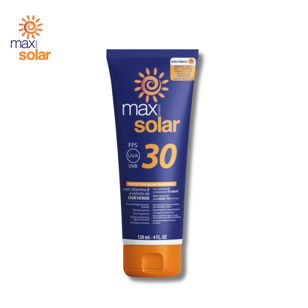 De textura leve e rápida secagem, MAX PROTETOR SOLAR FPS 30 facial e corporal é indicado