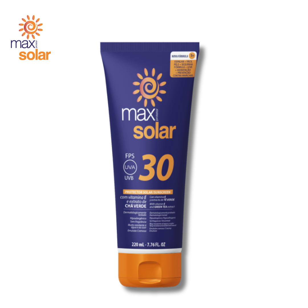De textura leve e rápida secagem, MAX PROTETOR SOLAR FPS 30 facial e corporal é indicado especialmente para pele muito sensível a queimadura solar pois oferece alta proteção. Não é comedogênico. Protege a pele sem obstruir os poros e sem deixa-la oleosa. Contém Extrato de Chá Verde e Vitamina E, antioxidantes que inibem a ação dos radicais livres, prevenindo o envelhecimento precoce.